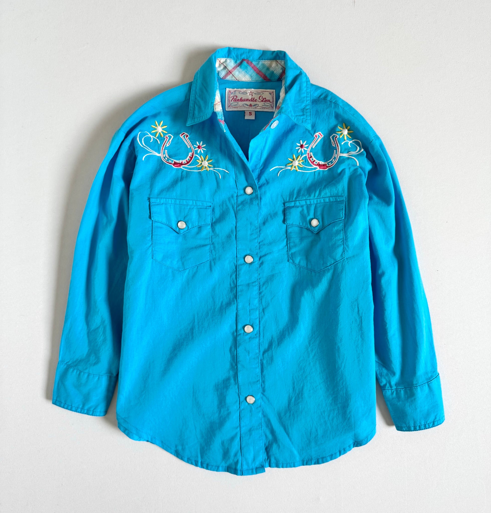 Brand: Panhandle SlimColor/Design: BlueSleeve: LongSize: Kids S/614in Shoulder width17in Body width18.5in LengthWeight: 4ozCondition: Very GoodPlease check all photos for condition....ヴィンテージ 蹄鉄刺繍 ウエスタンシャツサイズ: おおよそ 110-120cm※ご購入前に必ず下記の実寸をご確認いただきますよう宜しくお願いします。肩幅 35.5cm身幅 43cm丈 47cm