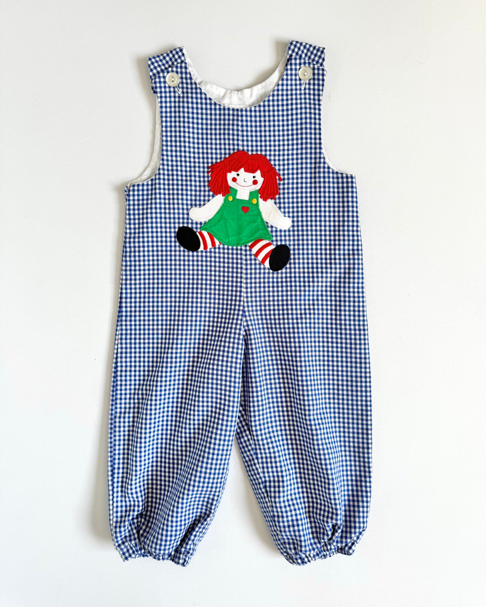 ヴィンテージ ドールアップリケ チェック柄つなぎロンパース