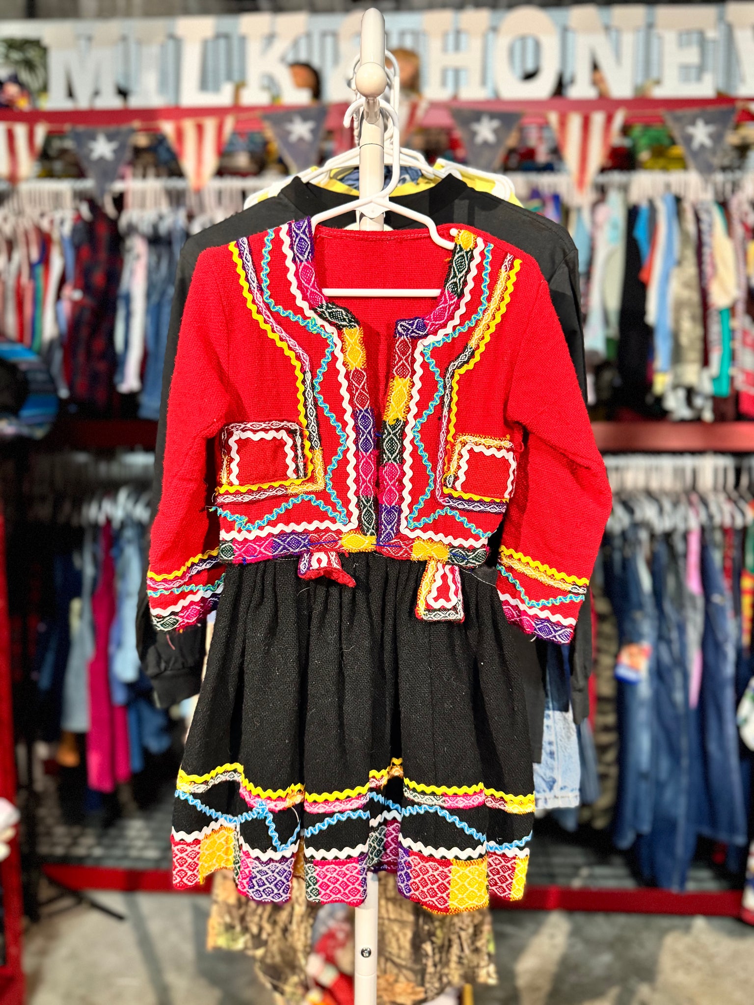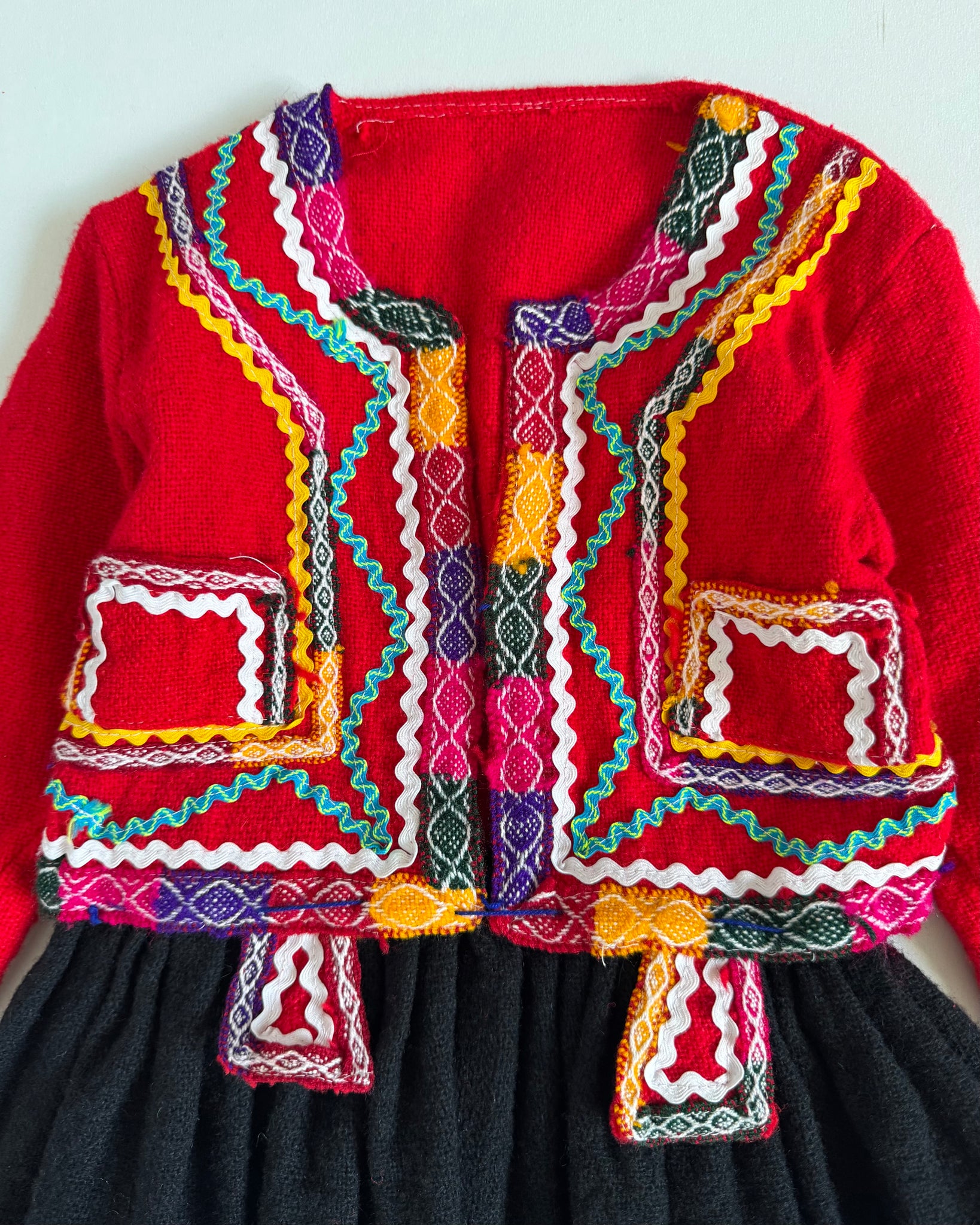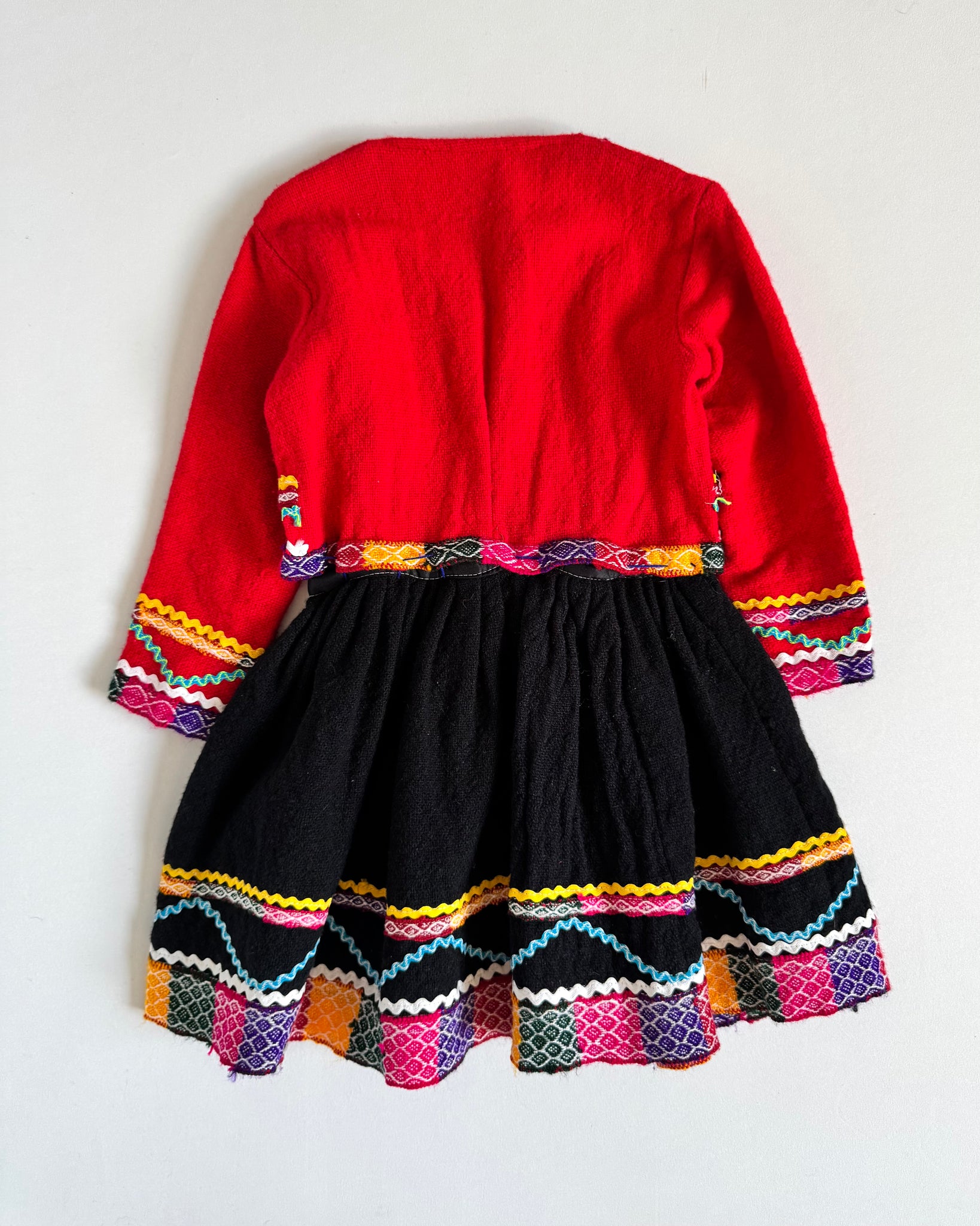 Color/Design: Red/BlackSleeve: LongSize: Approx 5T12in Shoulder width12.5in Body width23.5in LegthWeight: 13ozCondition: GoodPlease check all photos for condition....USED ペルー 刺繍ワンピースサイズ: おおよそ 110cm※ご購入前に必ず下記の実寸をご確認いただきますよう宜しくお願いします。肩幅 30.5cm身幅 31.5cm丈 59.5cm