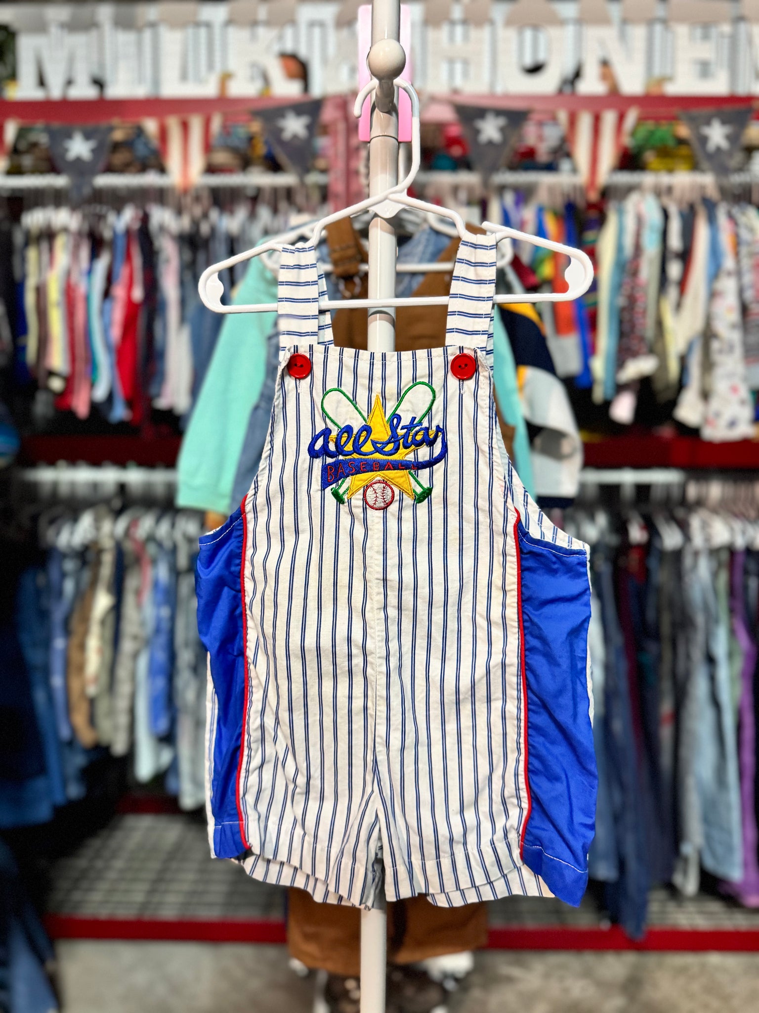 Color/Design: White/BlueMaterial: 100% CottonSize: 4T12 1/4in Body width19in Length18in Shoulder to CrotchWeight: 4ozCondition: GoodPlease check all photos for condition....ヴィンテージ オールスター ベースボール ショート オーバーオールサイズ: おおよそ 100cm※ご購入前に必ず実寸サイズをご確認ください。身幅 31cm丈 48cm肩から股にかけて 45.5cm
